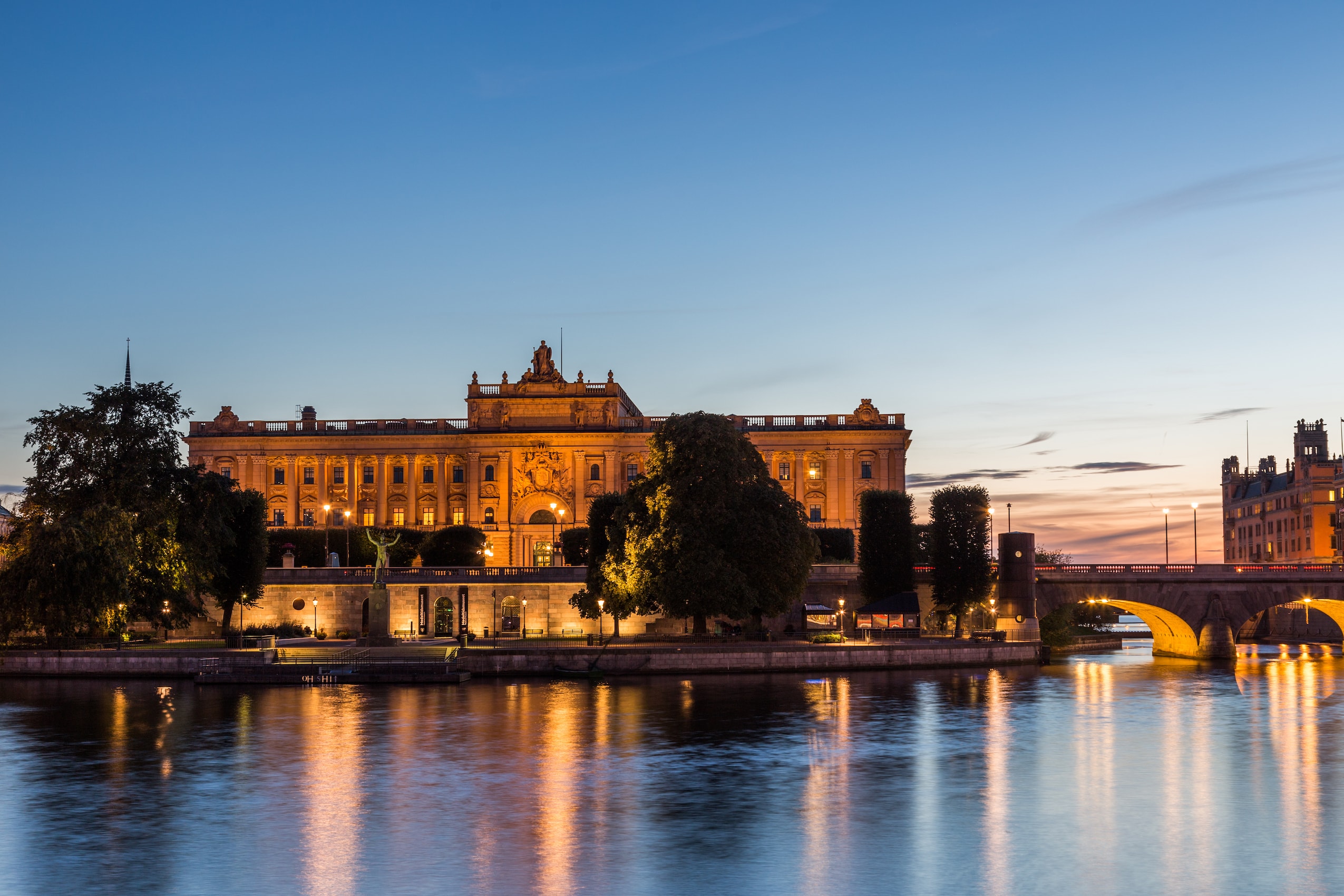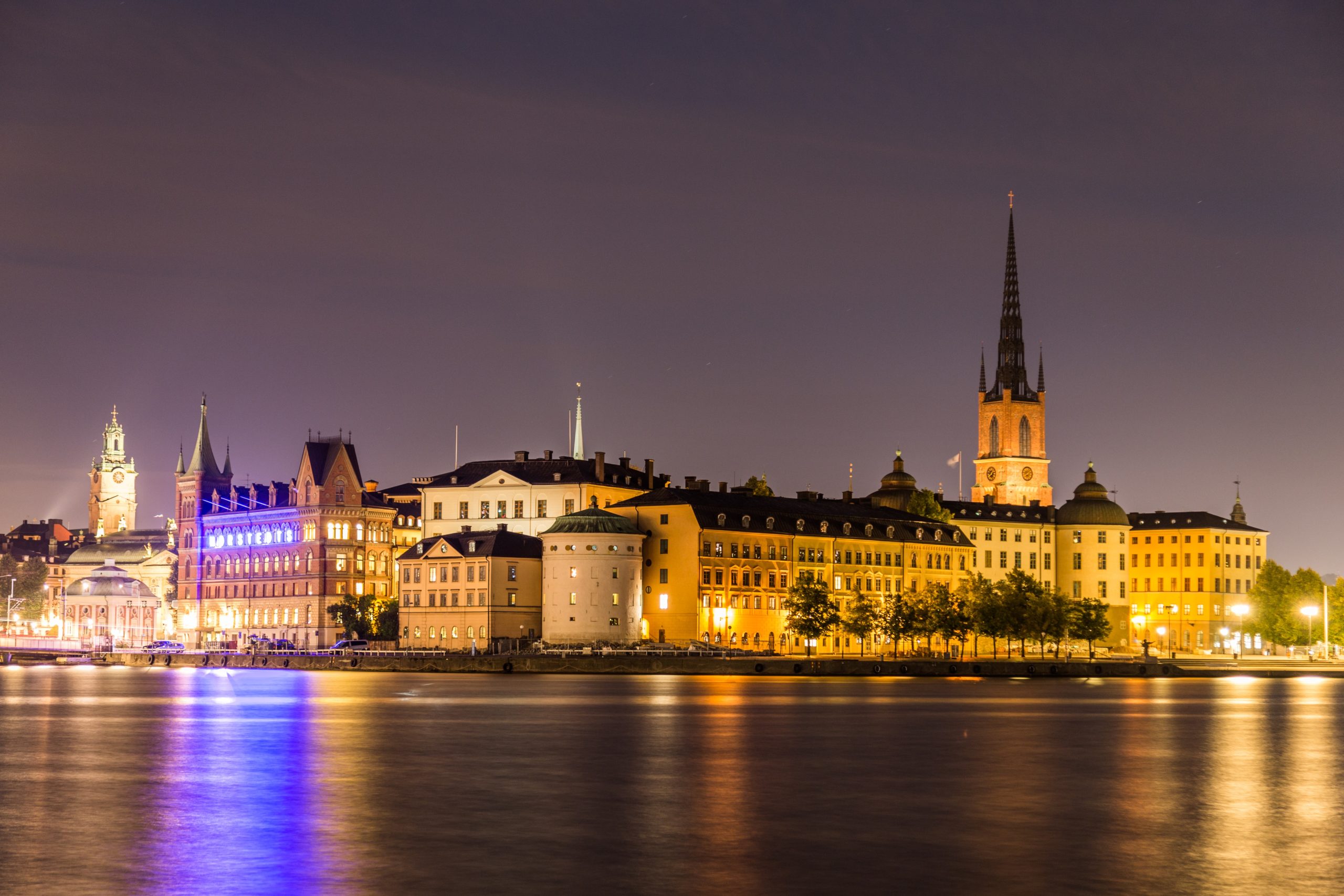 Engelbrekt Monument at night, with Riddarholmen in the background.
